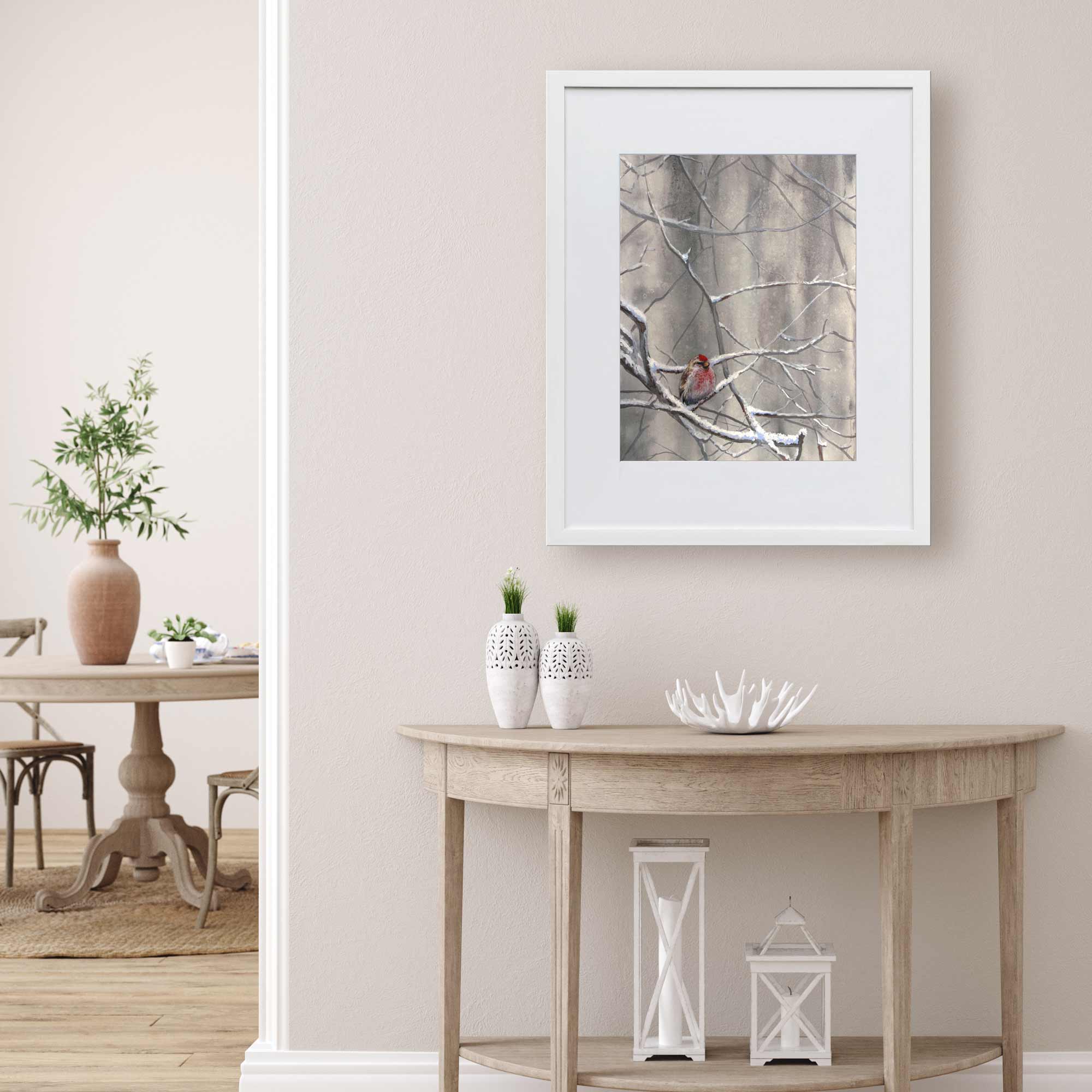 Bird wall art print of framefd winter painting. The artwork by Karen Whitworth hangs in a living room with bright airy neutral home decor.